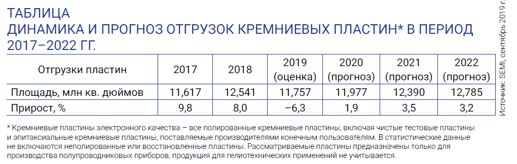 Увеличение выпуска ИС основано на поставках необработанных кремниевых пластин, также обладающих своей динамикой. По данным Международной ассоциации поставщиков материалов и оборудования для полупроводниковой промышленности (SEMI), после небольшого спада отгрузок пластин в 2019 г. в дальнейшем их рост возобновится и в 2022 г. будет достигнут новый рекорд.