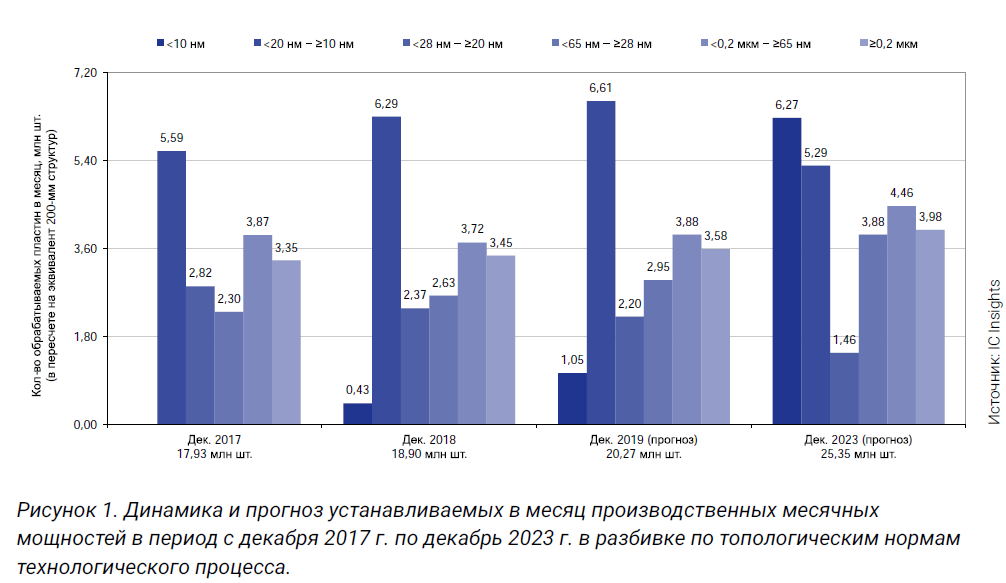 По данным корпорации IC Insights (Global Wafer Capacity 2019–2023 report), с точки зрения устанавливаемых ежемесячно новых производственных мощностей в 2015 г. наибольшая доля приходилась на оборудование под современные технологические процессы с топологиями менее 28 нм. Как ожидается, к концу 2019 г. на данные мощности придется около 49% общих мощностей микроэлектронной промышленности. При этом на оборудование, выпускающее ИС по технологическим процессам с проектными нормами <10 нм, в 2019 г. придется 5% мировых мощностей, а в 2023 г. их доля достигнет 25% и данные мощности станут крупнейшим сегментом парка устанавливаемого оборудования (рис. 1).