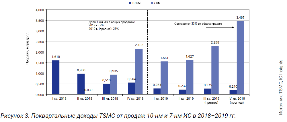 В 2019 г. корпорация TSMC рассчитывает получить 66% доходов от продаж ИС, произведенных по производственным процессам с проектными нормами менее 40 нм. При этом доход от продаж 7-нм ИС составит 8,9 млрд долл. (рис. 3). На эти ИС придется около 26% общих продаж TSMC за 2019 г. (и 33% – за IV кв.).