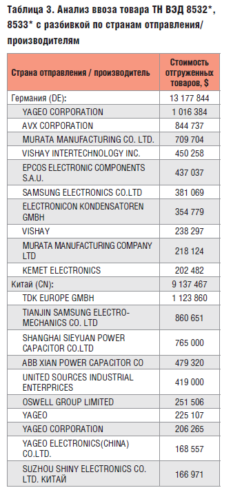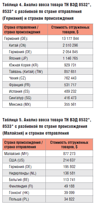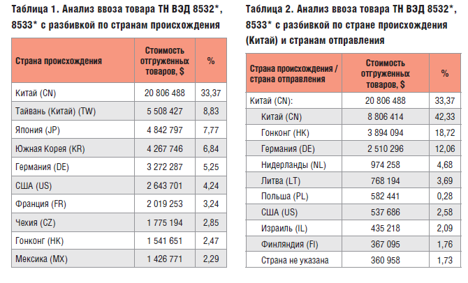 Следует учитывать, что авторы взяли все цифры в сумме, я же позволю себе немного сузить область рассмотрения. В принципе, данный анализ возможно повторить для любого кода номенклатуры. Для этого нужно просто иметь доступ к системам обработки ВЭД [2], немного знать ситуацию на рынке и обладать нестандартным мышлением. Итак, возьмём для анализа конденсаторы и резисторы. Это достаточно распространённая номенклатурная группа: данные изделия занимают минимум 30% строк в любой спецификации заказчика.