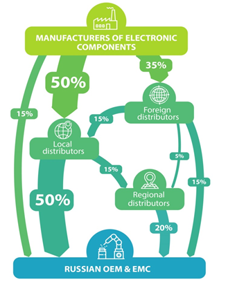 The order of numbers generally corresponds to reality, although the scheme is conditional, since local Russian players, such as “Compel”, “Symmetron”, “Promeletronika” also carry out, among themselves, the exchange of goods and volumes are sometimes significant. They also buy a lot from new local players, such as “Elitan”.