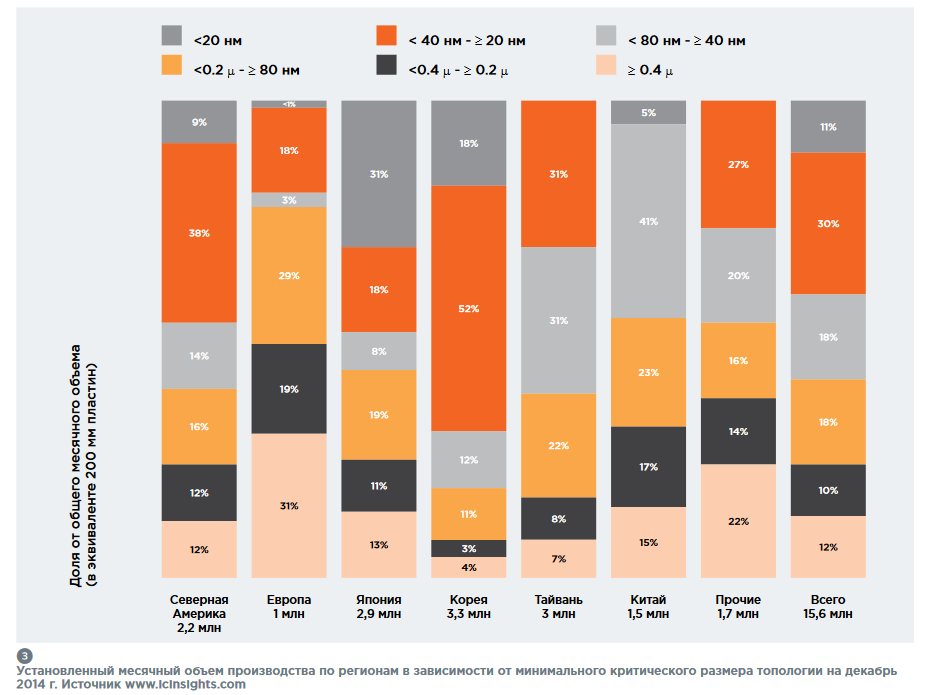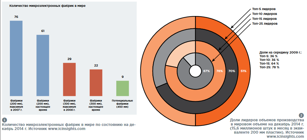 Характеристика состояния мировой микроэлектроники приведена на рисунках РИС1, 2, 3 и t2, где видно, что объём производства МОП-структур с проектными нормами менее 80 нм составляет уже около 60 %. Таким образом, в мировой микроэлектронике продолжается укрупнение основных производителей и концентрация ресурсов, стоимость «входного билета» продолжает увеличиваться (например, последняя новость о том, что SK Hynix планирует потратить около 26 миллиардов долларов на строительство двух новых заводов). Вместе с тем, в последние годы наблюдается устойчивая тенденция ускоренного развития направлений микроэлектроники, которые получили устойчивое название «больше чем Мур». Позвольте сделать вы-вод: классическое копирование мировых подходов по созданию микроэлектронных производств (а ля Intel, AMD, ST Microelectronics, Samsung, TSMC и так далее) в России невозможно. Причем, не потому, что нет денег, а потому, что не нужно, не эффективно и не отражает современного состояния и достижений мировой науки и промышленности. Существуют конкретные объективные причины отставания российской микроэлектроники (мы не говорим сейчас о частных ошибках):
