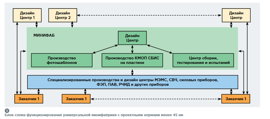 Как решается задача? Как и везде в мире — созданием минифабов, нацеленных на производство заказных специализированных ИС широкой номенклатуры и малой серийности. С развитием технологии наноимпринтной литографии, технологий SMIF и FOUP, кластерного оборудования появилась возможность существенно снизить эксплуатационные затраты такого производства, повысить гибкость и эффективность. Такой минифаб может либо взаимодействовать, либо частично или полностью включать в себя специализированные производства МЭМС, СВЧ, силовых приборов, фотоэлектронных приборов и других устройств, которые требуют современной интеграции с КМОП процессором и памятью в системе на кристалле (SOC) или в системе в корпусе (SIP).