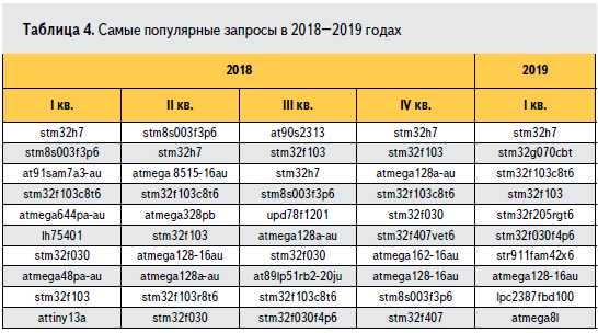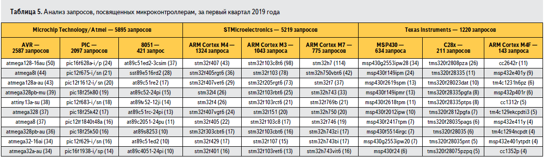 Первый квартал 2019 года (последний из рассматриваемых) мы решили изучить немного подробнее. В таблице 5 для трех наиболее часто запрашиваемых производителей микроконтроллеров приведены данные о количестве запросов по различным типам ядер и о наиболее популярных запросах по этим типам.