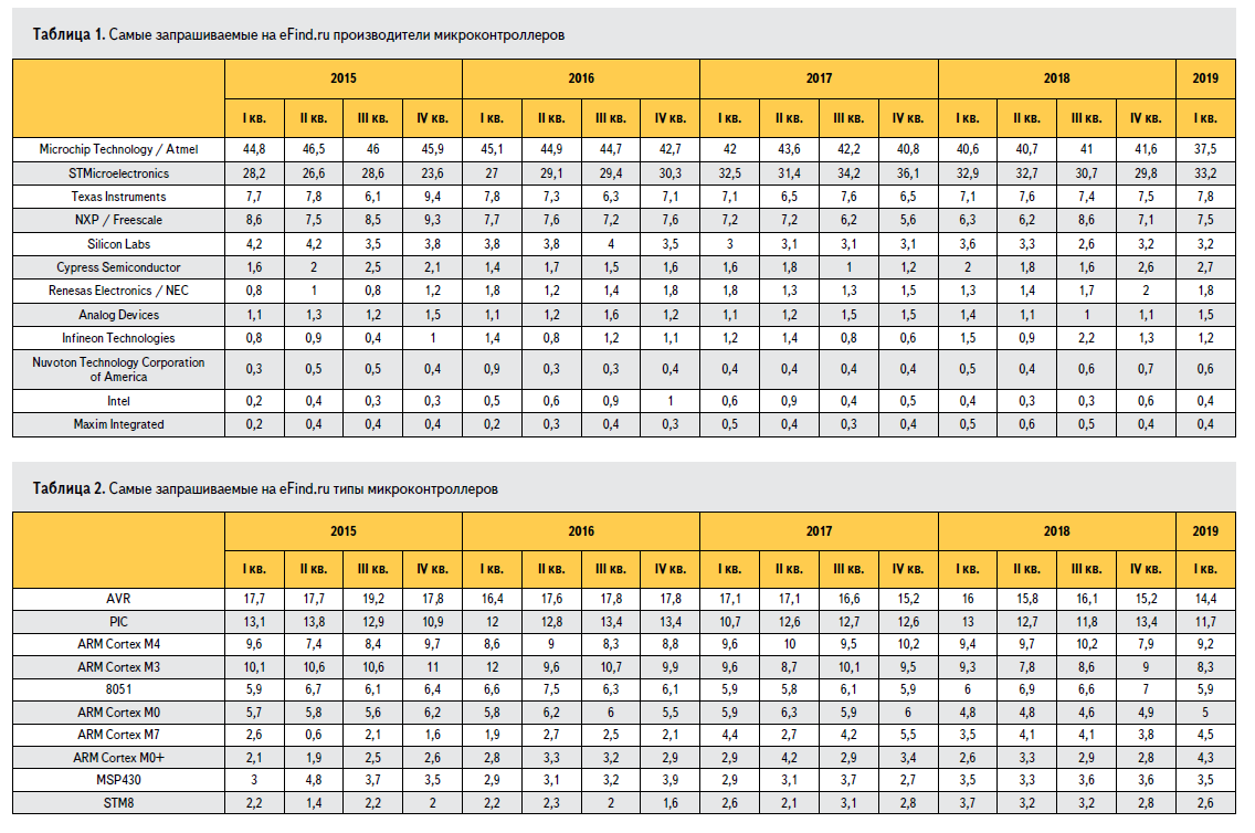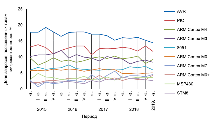 В статье приводятся данные, касающиеся интереса пользователей eFind.ru к микроконтроллерам. В качестве основы для анализа мы взяли статистику поисковых запросов за период с января 2015 по март 2019 года. Подобный анализ мы уже проводили в [1, 2], а в настоящей статье расширили рассматриваемый период и пополнили базу партномеров микроконтроллеров, с помощью которой выделяли нужные нам запросы.