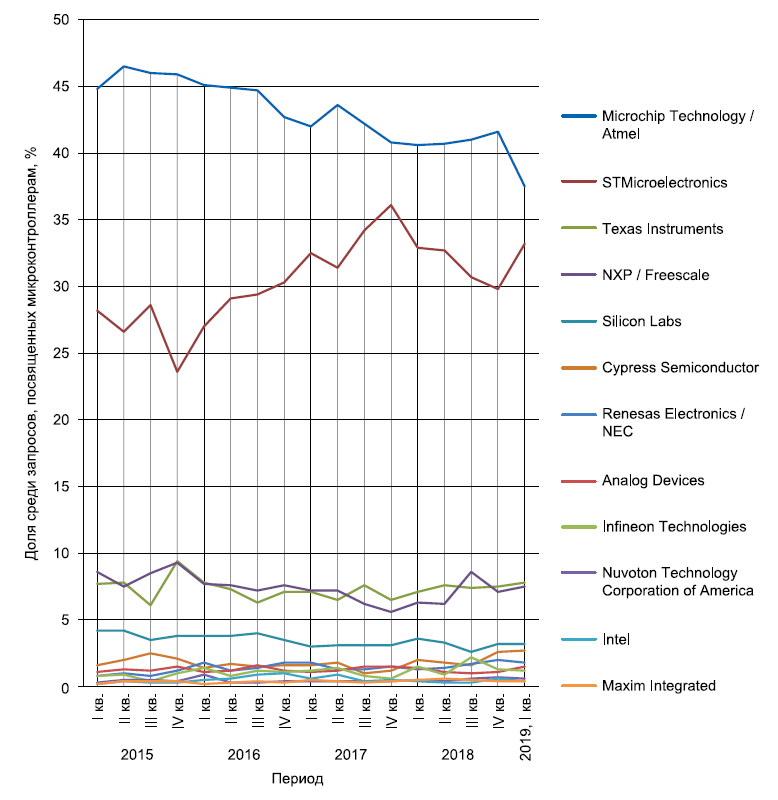 На рис. 1 и в табл. 1 приведены производители микроконтроллеров, чью продукцию чаще всего запрашивают на eFind.ru. Данные приведены по кварталам. Указывается доля конкретного производителя среди всех запросов, посвященных микроконтроллерам. Производители отранжированы по их доле в первом квартале 2019 года.