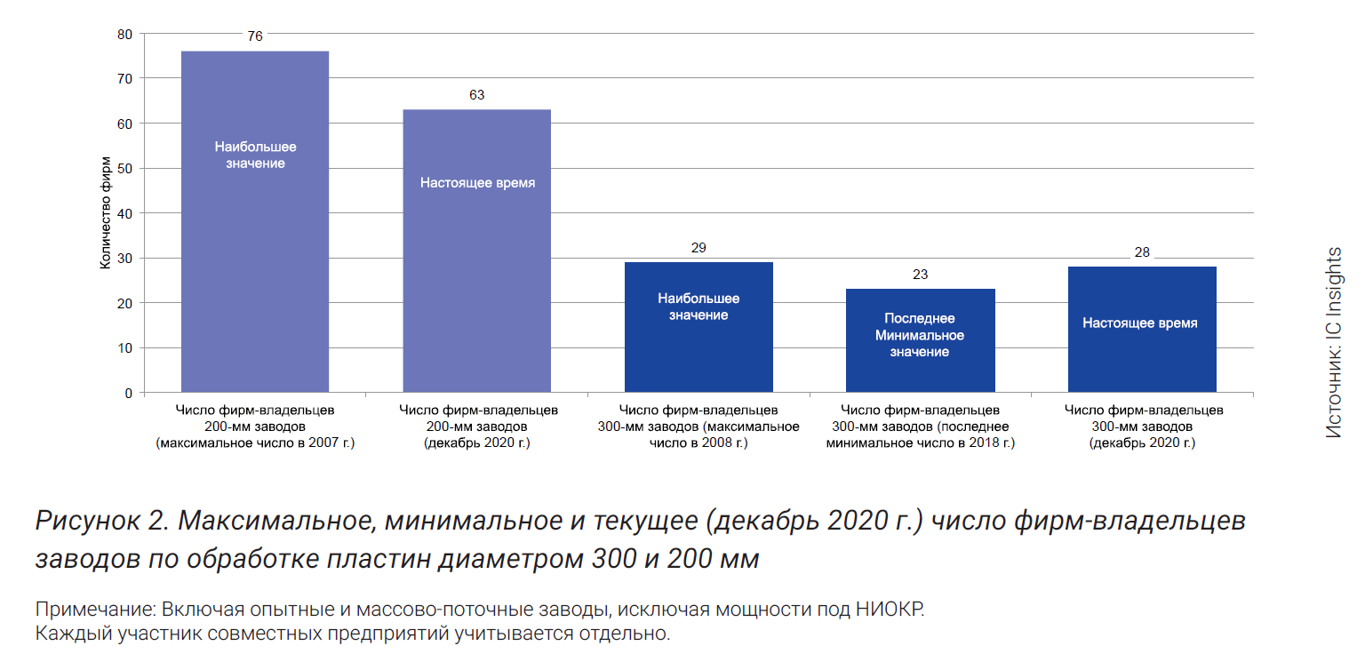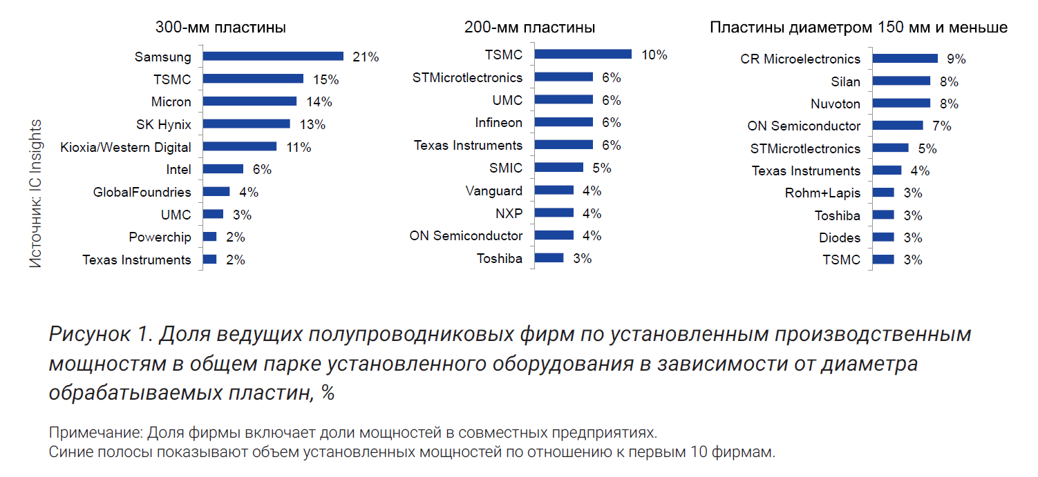 Среди крупнейших обладателей мощностей по обработке 300‑мм пластин оказались крупнейшие поставщики схем памяти (ДОЗУ и флэш-памяти NAND-типа), такие как Samsung, Micron, SK Hynix и Kioxia/Western Digital. Также в рейтинг вошли четыре крупнейших «чистых» кремниевых завода: TSMC, GlobalFoundries, UMC и Powerchip (с учетом Nextchip). Кроме того, в этой десятке оказалась и корпорация Intel, крупнейший производитель микропроцессоров. Эти фирмы производят ИС, которые больше всего выигрывают от производства на пластинах самого большого диаметра, что обеспечивает существенное снижение удельных (на кристалл ИС) издержек производства. Кроме того, у этих фирм есть возможность осуществления крупных инвестиций в новые, более совершенные заводы по обработке 300‑мм пластин (по все меньшим проектным нормам). К лидерам по парку установленного оборудования для обработки 200‑мм пластин относятся «чистые» кремниевые заводы и производители, специализирующиеся в основном на аналоговых и цифро-аналоговых ИС и микроконтроллерах.