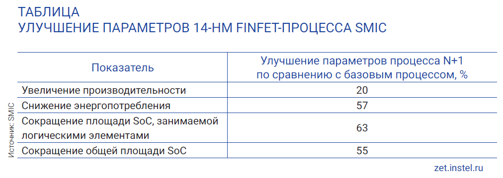По сравнению с существующим 14-нм процессом SMIC характеристики «систем-накристалле» (SOC), реализованных по процессу N+1, существенно улучшены (см. таблицу).