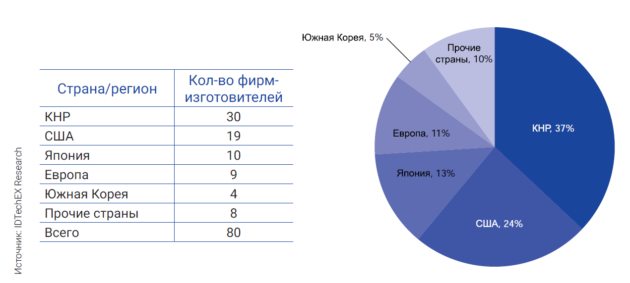 Специалисты исследовательской фирмы IDTechX Research (Кембридж, Великобритания), одного из активных приверженцев новых технологий зарядки и хранения энергии, предсказывают, что суперконденсаторы в конечном итоге «узурпируют» область современных технологий аккумуляторных батарей, в частности литий-ионных. Ожидается, что в течение следующих двух десятилетий на рынок выйдут около 80 производителей суперконденсаторов, а в автотранспорте на смену двигателям внутреннего сгорания придут электромоторы, появятся поезда на магнитной подвеске и ряд других подобных технологий. При этом по мере увеличения числа производителей электромобилей будет расти и число поставщиков суперконденсаторов. Лидером, по оценкам, станет КНР – к 2041 г. там появятся около 30 производителей этих систем (см. рисунок).