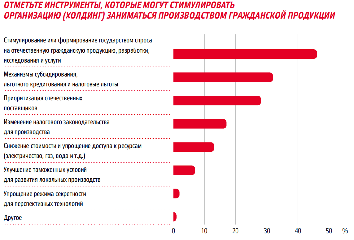 Рисунок 2. Наиболее эффективные меры стимулирования производства гражданской продукции, по мнению респондентов