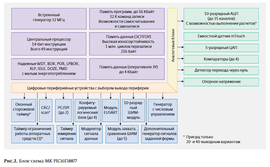 В семейство PIC16F1887 7 (рис.2) входят 10 МК с флеш-памятью емкостью до 56 Кбайт, поставляемые в корпусах с числом выводов от 8 до 40. МК семейства – первые контроллеры со встроенным АЦП, выполняющим функции накопления, усреднения, НЧ-фильтрации и сравнения с опорными данными без участия программных средств. Они выполнены по доработан-ной XLP-технологии, позволившей сократить энергопотребление схемы в режимах покоя и активности. И еще – это первые МК с возможностью блокировки неиспользуемых периферийных модулей и отключения их от шины питания или дерева синхронизации, то есть с возможностью исключать просачивание мощности.