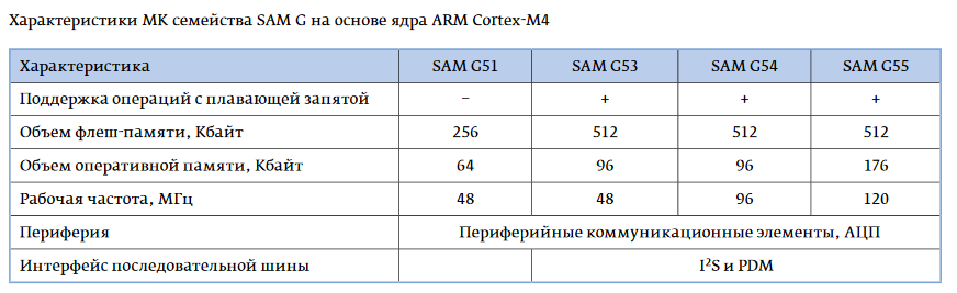 К одним из новейших МК для Интернета вещей относятся микроконтроллеры семейства SAM G на основе ARM Cortex-M4 с поддержкой операций с плавающей запятой, которые компания Atmel анонсировала в начале 2014 года. В семейство входят полностью совместимые, вплоть до корпусов, четыре серии – SAM G51, SAM G53, SAM G54 и SAM G55. МК предназначены для высокопроизводительных систем со сверх-низким энергопотреблением – до 100 мкА/МГц в активном режиме и менее 7 мкА в режиме глубокого сна с сохранением данных в оперативной памяти (пробуж-дение из режима глубокого сна занимает менее 3 мкс до выполнения первой инструкции в активном режиме). Микросхемы оснащены богатым набором периферийных устройств, в том числе 12-разрядным АЦП и блоком прямого доступа к памяти, отличаются оптимальным соотношением объемов оперативной и флеш-памяти – до 176 и 512 Кбайт соответственно (см.таблицу). Заключены контроллеры в компактный корпус WLCSP размером 3×3 мм с числом выводов 49 или 100.