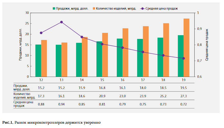 Согласно уточненному варианту обзора McClean Report за 2015 год компании IC Insights, благодаря большому спросу на МК для смарт-карт и росту применения 32-разрядных устройств в системах, предназначенных для IoT, темпы отгрузок микроконтроллеров за рассматриваемый год ожидаются высокими – 33%. На рынок будет поставлено 25,4 млрд. МК. Правда, доходы от продаж увеличатся по сравнению с предыдущим годом лишь на 4% и составят 16,6 млрд. долл. Это обусловлено резким снижением цен на микроконтроллеры, в первую очередь, 32-раз-рядные микросхемы для приложений Интернета вещей. По прогнозам IC Insights, средняя цена продаж МК в 2015 году уменьшится на 21% до 65 центов за изделие, в 2016-м ожидается дальнейшее снижение цены еще на 14%. В период с 2014 по 2019 годы средняя цена продаж МК будет падать при совокупных темпах немного меньше – 3,5%. Хорошая новость для покупателей – средняя цена продаж МК в 2019 году составит 0,72 долл. (рис.1).