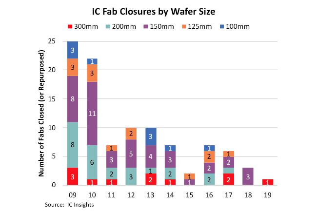 Совсем недавно, в марте 2019 года, «IC industry» выпустила примечательное сообщение: «100 IC Wafer Fabs Closed or Repurposed Since 2009». В нём описывается ситуация с закрытием работающих заводов.