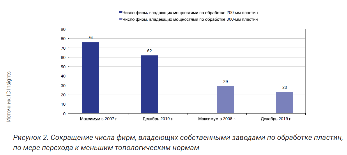 Модернизация заводов стала настолько дорогой, что даже крупнейшие компании не всегда считают экономически целесообразно её осуществлять. Например, в 2010 году «AMD» окончательно избавилась от фабрик и стала бесфабричной компанией. Конечно, это не всегда связано с ценой модернизации. Поглощения и покупки брендов, переход компаний на бесфабричную или на облегчённую фабричную модель ведения бизнеса, также приводит к закрытию заводов с устаревшим оборудованием, в рамках оптимизации производств. К примеру, согласно прогнозам «IC Insights», в следующие два года могут быть закрыты ещё четыре завода: один компании «NJR», два — компании «Renesas» и один — компании «Analog Devices». Причём «Renesas» и «Analog Devices» за последние 5 лет купили несколько брендов. Как показано на графике ниже, в основном закрывались заводы, обрабатывающие пластины диаметром менее 300 мм.