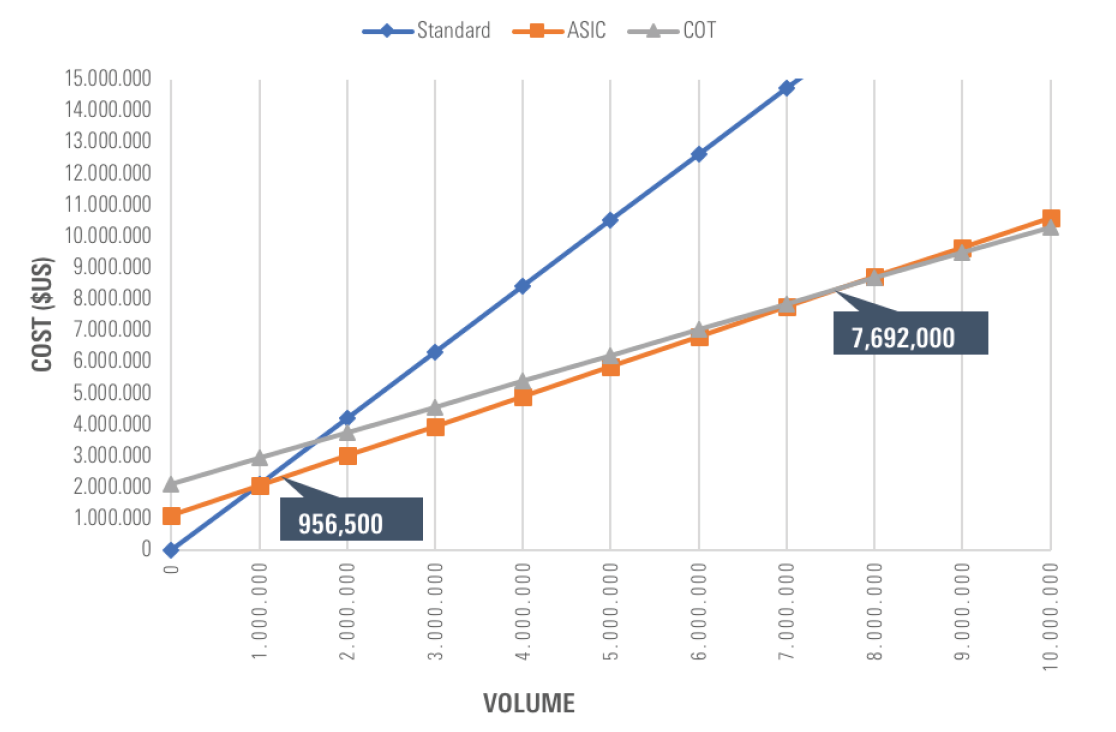 Хотя каждый проект уникален и выдвигает различные требования, влияющие на производственные решения, например, защита микросхем, возможность повторного использования, а также располагает различными финансовыми и человеческими ресурсами, основной параметр – всегда издержки. Как показывают данные в этой статье, ключевым фактором для определения наиболее экономически эффективной модели производства для вашего проекта может стать объем производства за весь срок работы. Ниже это показано на диаграмме, в которой общие затраты рассматриваются как функция объема. В нашем случае, модель ASIC оказывается более экономичной, чем использование стандартных компонентов, и требует производства около 1 млн единиц, в то время как финансовая эффективность модели COT достигается при объеме производства свыше 7,5 млн единиц.